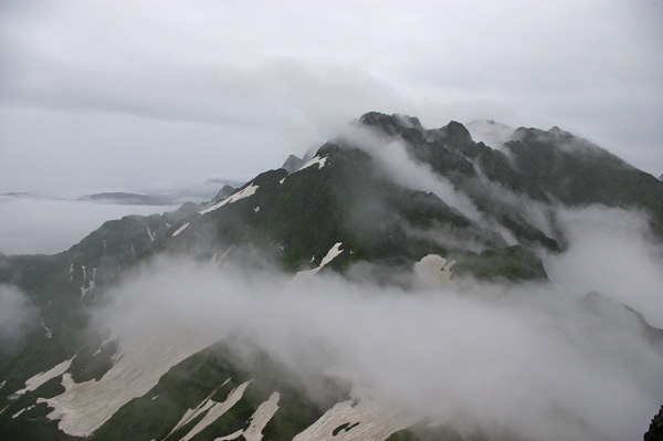 だが、こんな景色が見れたのもほんの10分で、 また辺りをガスが支配する。 南岳小屋のおばちゃんも、ガスが切れたのは久しぶりだと言う。 僕はつくづく日程選択ミスを呪った。 ちなみにこの日の朝の写真は 南岳小屋のページにも掲載されている。 (南岳小屋のページへ) 右下に写っているのがO波多氏とH田氏。 日付が17日となっているがこれは誤植で18日が正解である。