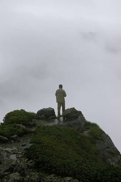 だが、僕が準備をして小屋の外に出てみるとなぜか、 H田さんが北穂高方面を見ている。 H田「なんか行けそうな気がしませんか?」 N藤「そうですね〜、なんとなく、風も昨日に比べると全然ないし・・・。 こっちから行ってもコースタイムは同じくらいですよね」