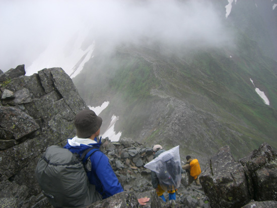 なんせ毎年数名の死亡者と数多くの重傷者がでているという 細く切れ落ちたコースである。 しかもこの雨。 幸い風はあまり強くないが、 それでもこの濡れた岩はやばい。 冗談ではなく、 自分の死を一寸先に感じるほどの緊張感がここにはある。